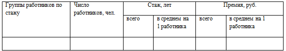 Для выявления зависимости между стажем работы и размером премии работников предприятия произведите группировку работников по стажу работы, образовав четыре группы с равными интервалами. В каждой группе и итогу в целом подсчитайте: численность рабочих; стаж работы – всего и в среднем на одного работника; размер премии – всего и в среднем на одного работника.