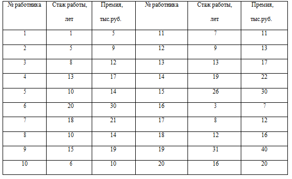 За отчетный период известны следующие данные о стаже работы и размере премии 20 работников предприятия: