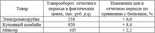 Имеются данные о реализации специализированным магазином товаров бытовой техники:Определите: • общий индекс цен по всей группе товаров; • дополнительную выручку, полученную магазином в отчетном периоде вследствие изменения цен на товары.