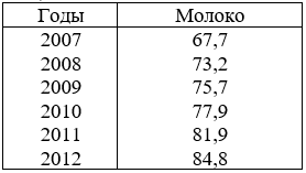 Имеются следующие данные о производстве молока в России за 2007-2012 гг., млн. т: