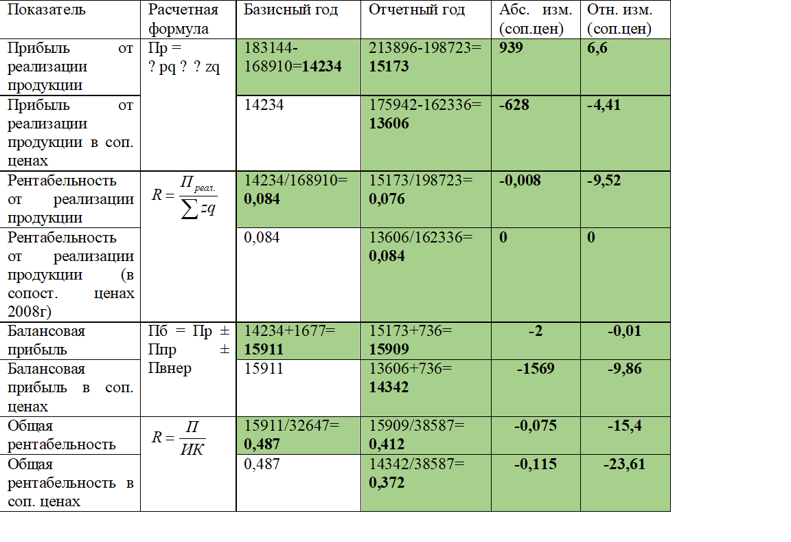 Абсолютное и относительное изменения рассчитанных показателей в отчетном году по сравнению с базисным.