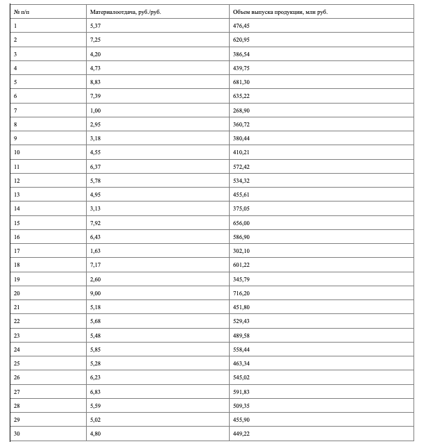 1) постройте статистический ряд распределения организаций (предприятий) по признаку – материалоотдача, образовав пять групп с равными интервалами;