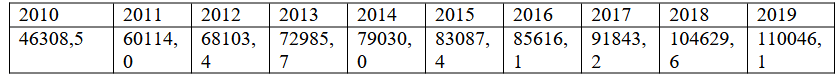 Таблица 2,1 – Валовый внутренний продукт в текущих ценах за 2010-2019 гг.,, млрд, руб.,1
