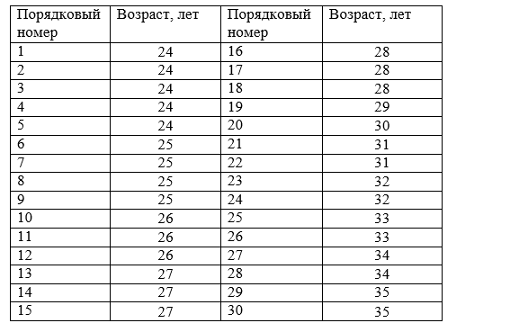 (возраст, лет) : 30, 24, 32, 26, 28, 25, 34, 31, 25, 25, 31, 33, 35, 27, 24, 26, 35, 32, 26, 24, 24, 34, 28, 28, 25, 27, 33, 24, 27, 29 .
