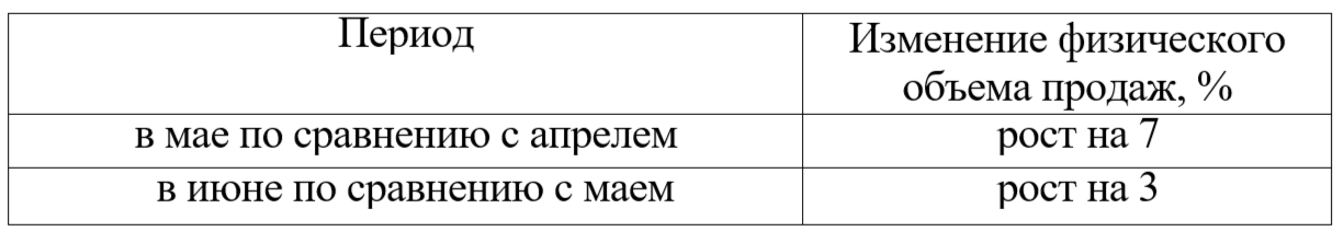 «Как изменится физический объем продаж в июне по сравнению с апрелем? (с точностью до 0,1%) при условии: Темп роста в мае: Трц = 107%»