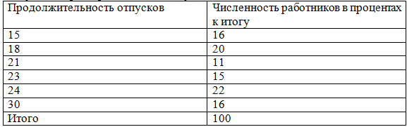 1. В отчетном периоде распределение работников по продолжительности отпусков характеризовалось следующими показателями