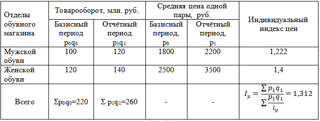 1) индивидуальные индексы средних цен по отделам и по универмагу в целом;