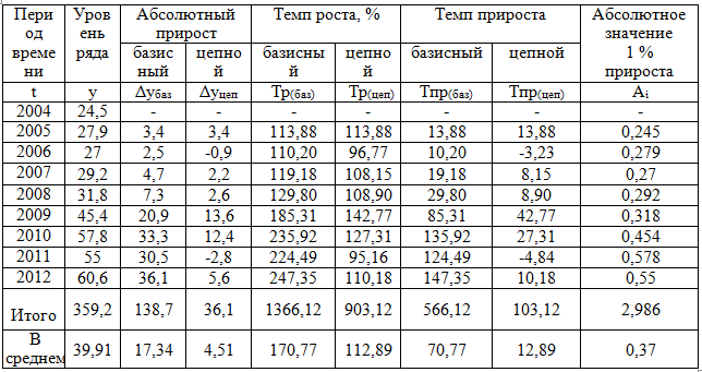Расчёт абсолютных и относительных показателей ряда динамики проведем в таблице следующей формы:
