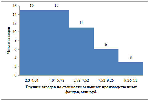 Рис. 1. Гистограмма распределения заводов по стоимости основных производственных фондов, млн.руб