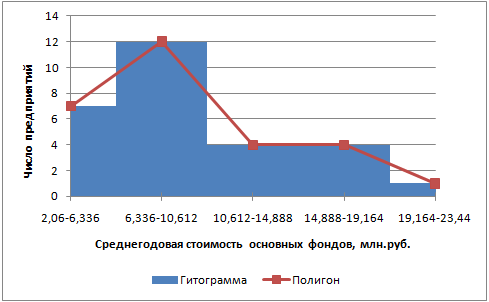 Рис. 1 Гистограмма и полигон распределения предприятий по среднегодовой стоимости основных фондов