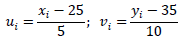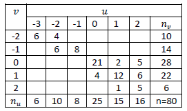 Составим преобразованную корреляционную таблицу с условными вариантами, в которой внесем значения 𝑛𝑢 и 𝑛𝑣