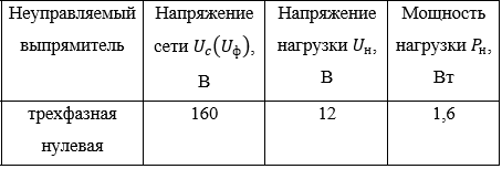 Резистивная нагрузка Rн запитывается выпрямленным напряжением, среднее значение которого Uн. Мощность, выделяемая в нагрузке Рн. Неуправляемый выпрямитель (схема) питается вторичным напряжением U2 трансформатора T, включенного в сеть, действующее напряжение которой Uc (для трехфазных схем выпрямления задается действующее напряжение фазы Uф)