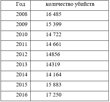 По данным ООН имеется информация о количестве убийств в США за 2008-2016 гг.: