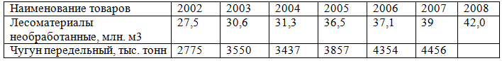 По данным таблицы рассчитайте: а) средний абсолютный прирост экспорта лесоматериалов и чугуна; б) средний темп роста экспорта лесоматериалов и чугуна; в) средний уровень ряда динамики экспорта лесоматериалов и чугуна.