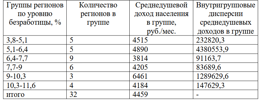 -Долю вариации среднедушевых доходов, обусловленную уровнем безработицы.