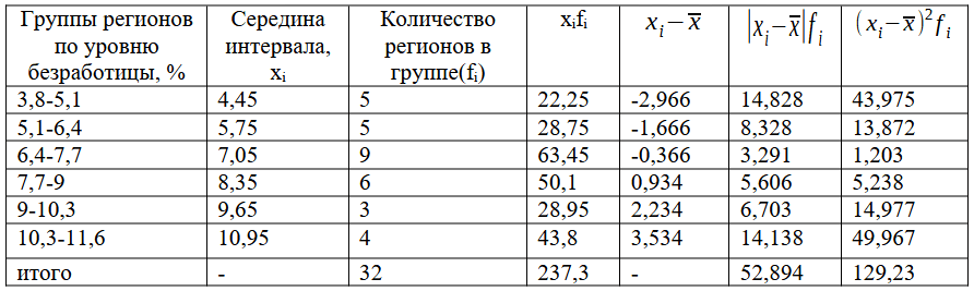 По данным выборки составлена группировка по уровню безработицы: Ответ: в среднем уровень безработицы отклоняется от среднего значения на 2% в абсолютном выражении и на 27,1% в относительном - 37,6% вариации