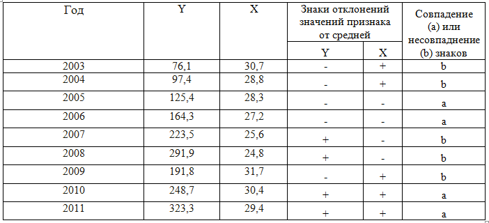 где na - число совпадений знаков отклонений индивидуальных величин от средней;