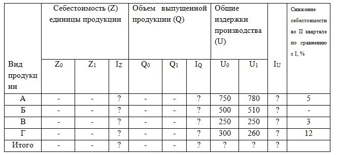 «По нижеприведенным данным вычислить общие индексы издержек производства, себестоимости единицы продукции и физического объема выпуска и заполнить пустоты»