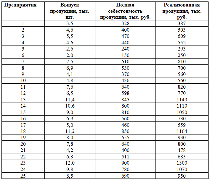 По приведенным данным (Таблица 1) по 25 предприятиям: