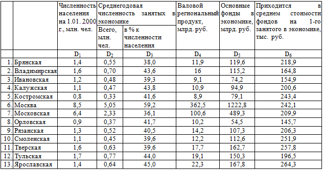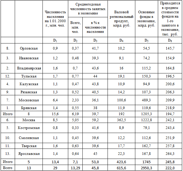 Постройте групповую таблицу, выделив группы территорий с уровнем фондовооружённости (D6): «до 240 тыс. руб.»; -«240 тыс. руб. и более». В сказуемом рассчитайте число территорий, в т.ч., в % к итогу, показатели обеспеченности ресурсами 1-ой территории, показатели доли занятых, фондовооружённости, фондоотдачи, выработки. Оформите таблицу с соблюдением известных правил. Проанализируйте результаты и основные выводы изложите в краткой аналитической записке.