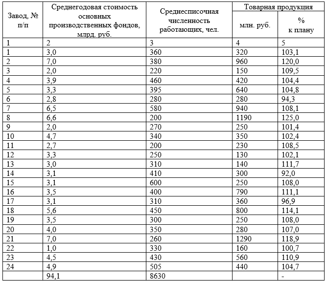 Имеются следующие данные о работе 24-х заводов одной из отраслей промышленности: