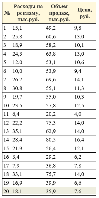 Проанализировать зависимость между объемами продаж товара и расходами на рекламу как с учетом влияния цены, так и без учета влияния цены.