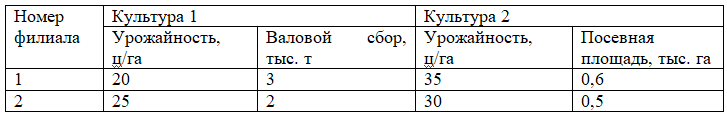 Работа акционерного общества, состоящего из двух филиалов сельскохозяйственного профиля, характеризуется следующими данными. Рассчитать среднюю урожайность культур по акционерному обществу.