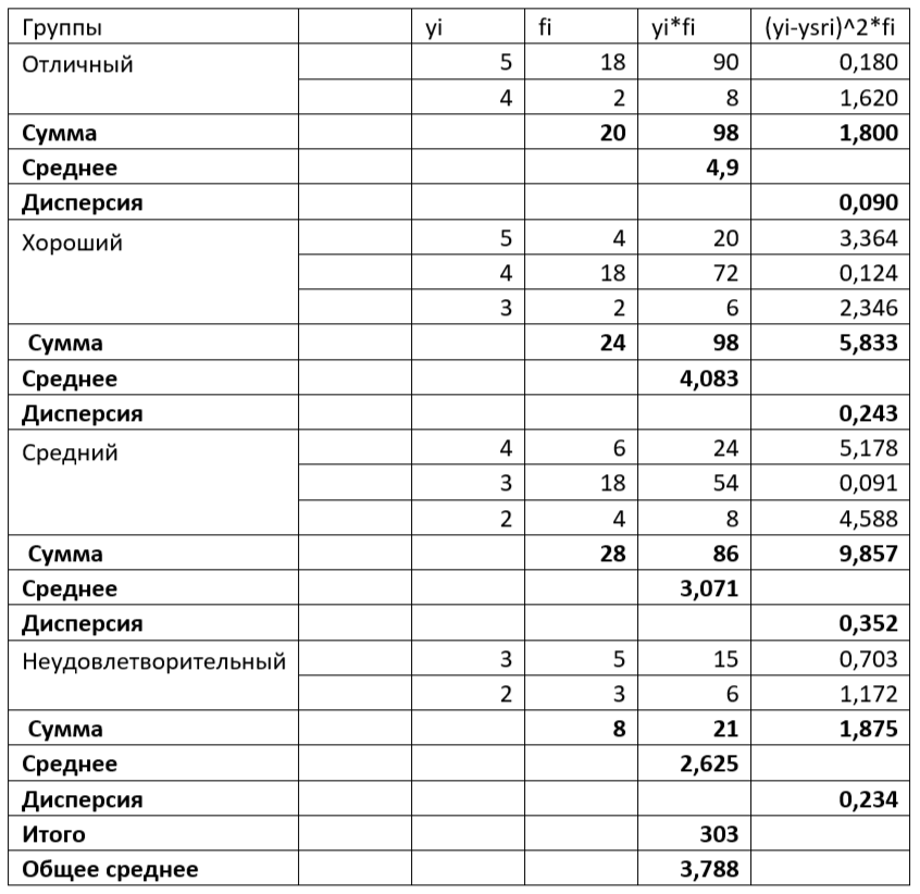 «С целью изучения зависимости успеваемости студентов от уровня их под-готовки сдающие экзамен по курсу были распределены на четыре группы (табл. 23). Определите: а) общую и групповую дисперсии; б) среднюю из групповых дисперсий; в) межгрупповую дисперсию.»