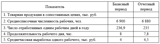 С помощью приема цепных подстановок определить влияние на объем товарной продукции изменения факторов: численности рабочих, отработанных каждым рабочим в среднем за год человеко-дней, продолжительности рабочего дня и среднечасовой выработки рабочего.