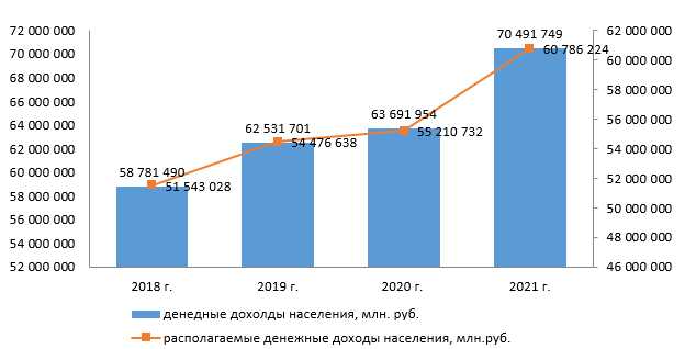 На протяжении анализируемого четырехлетнего периода отмечается устойчивая тенденция роста уровня денежных доходов населения. Если в 2018 году денежные доходы населения РФ составляли 58781490 млн...