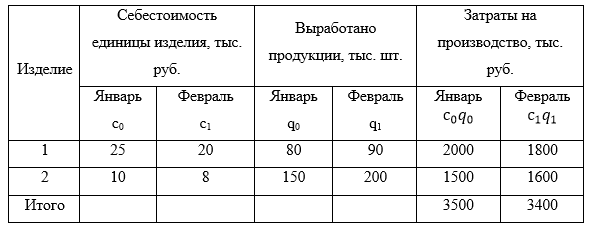 Себестоимость и объем продукции завода характеризуются следующими данными: Определите: 1) общий индекс затрат на все изделия; 2) общий индекс себестоимости единицы изделия; 3) общий индекс физического объема продукции.