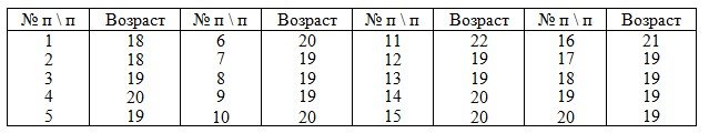 2. Рассчитайте средний возраст студентов по не сгруппированным данным, используя методику расчета простой средней величины. Данные для расчета среднего возраста студентов в группе из 20 человек приведены в таблице 1.