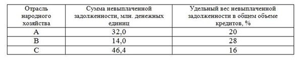 1. Сумма невыплаченной своевременно задолженности по кредитам на 1 июля составила 92,4 млн. денежных единиц. По отдельным отраслям экономики она распределялась следующим образом: