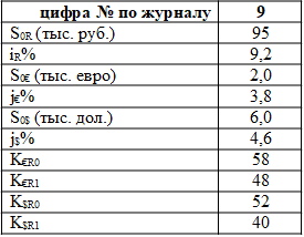 В банке открыт мультивалютный вклад сроком на один год на суммы: S0R под iR% годовых; S0€ под j€% годовых; S0$ под j$% годовых с выплатой процентов в конце срока вклада. Найти эффективную процентную ставку мультивалютного вклада при значениях курса обмена валют в начале и в конце срока мультивалютного вклада K$R0; K$R1; K€R0; K€R1 приведенных в таблице.