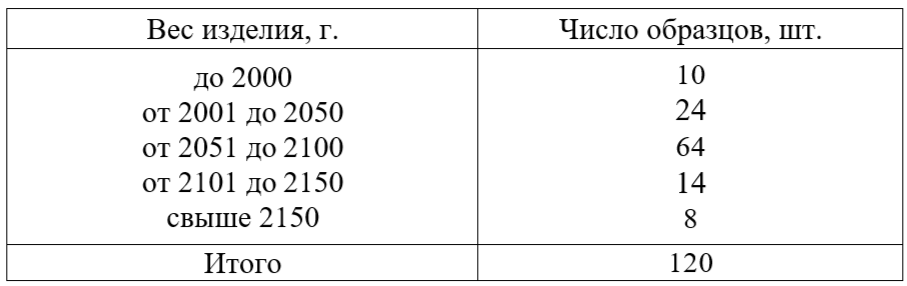 При условии, что к стандартной продукции относятся изделия с весом от 2001 до 2100 г., установите для всей партии: