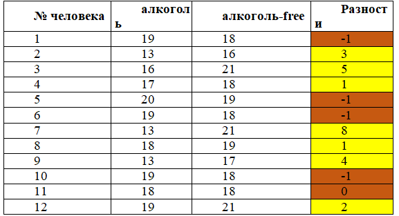 В исследовании, посвященном влиянию алкоголя на когнитивные способности человека, оценили способность к запоминанию имен у одних и тех же людей после употребления алкоголя ( в дозировке 1 г на кг массы тела) и в трезвом состоянии.