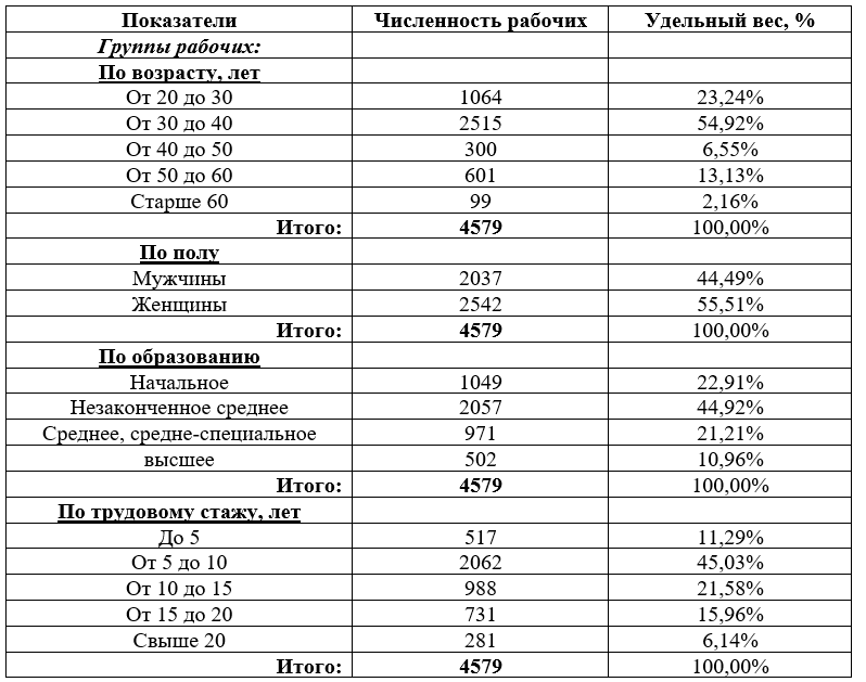 а) произвести расчет удельного веса каждой группы работников в общей численности работников предприятия;