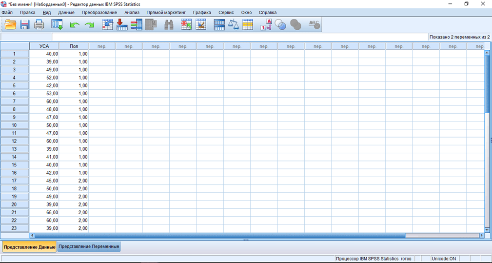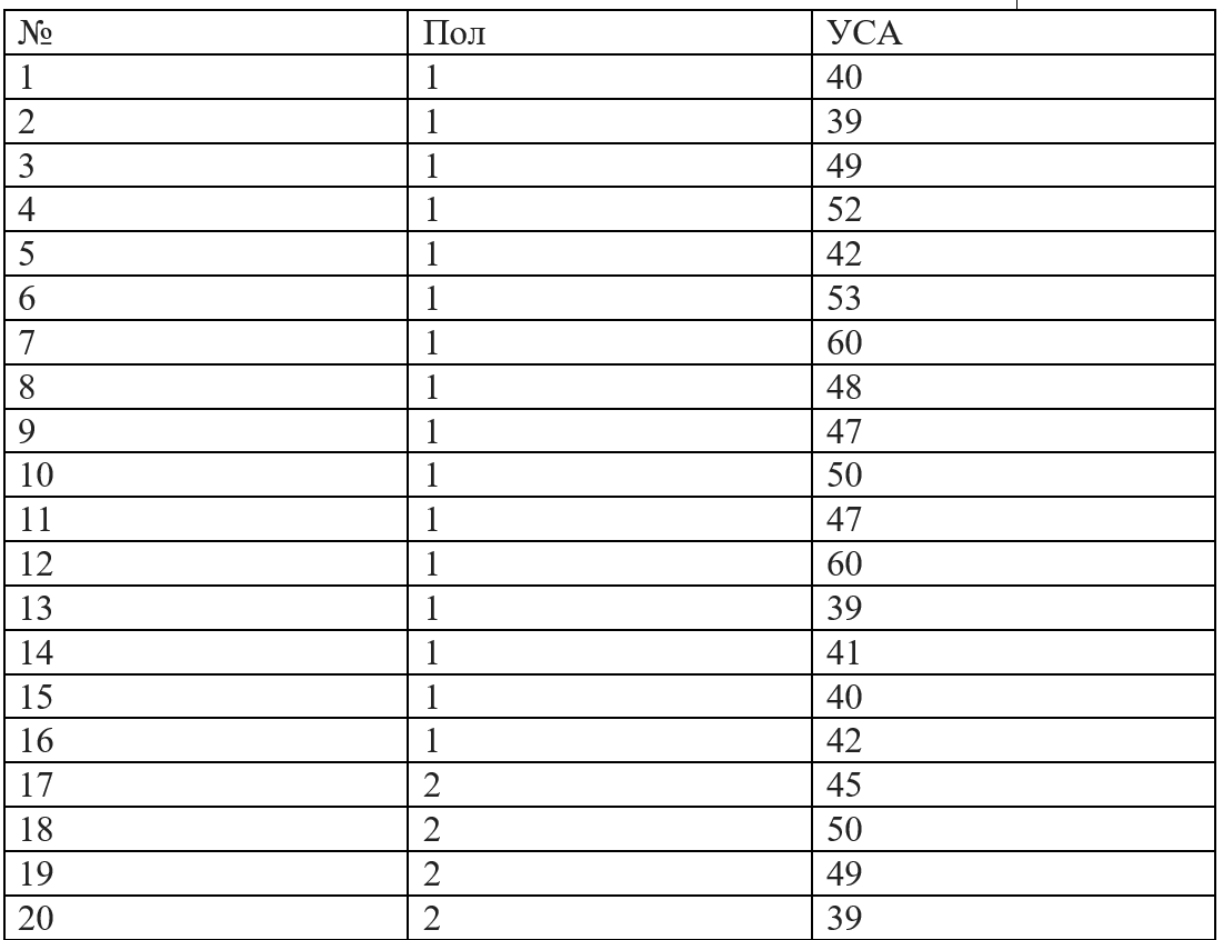 В страховых компаниях исследовался уровень самоактуализации работников (УСА). Результаты приведены в таблице, в которой использованы следующие обозначения: для пола: 1 – мужской, 2 – женский.