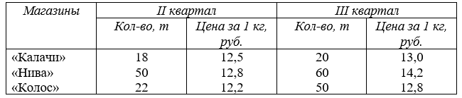 «В таблице приведены данные о реализации пшеничного хлеба в нескольких специализированных фирменных магазинах города за два квартала:»