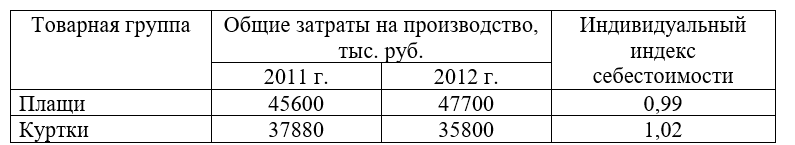 «Вычислите общий индекс себестоимости товаров и абсолютный размер экономии (перерасхода) денежных средств, вычислите индекс общих денежных затрат на производство товаров и общий индекс физического объема производства.»