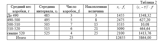 В процессе подготовки выборочного обследования импортируемых в коробках кондитерских изделий была проведена пробная проверка коробок для сбора данных о вариации их веса (1%-ная механическая выборка). Результаты проверки представлены в таблице:
