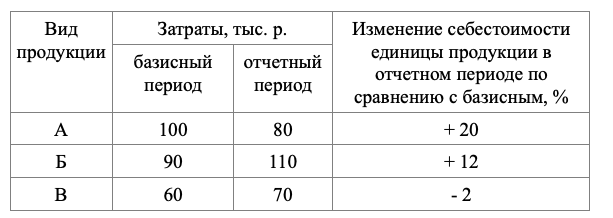 1) Известно, что в отчетном периоде по сравнению с базисным периодом изменение себестоимости единицы продукции А составило +20%, продукции Б +12% и продукции С -2%, тогда индивидуальные индексы себестоимости составят: