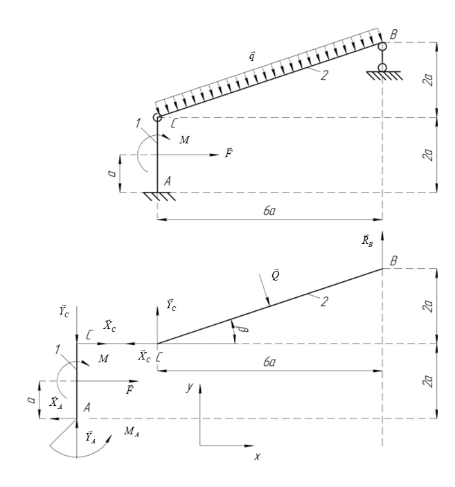 Рассмотрим отдельно тела 1 и 2 с приложенными к ним активными силами и реакциями связей. Распределенную нагрузку заменяем сосредоточенной силой: