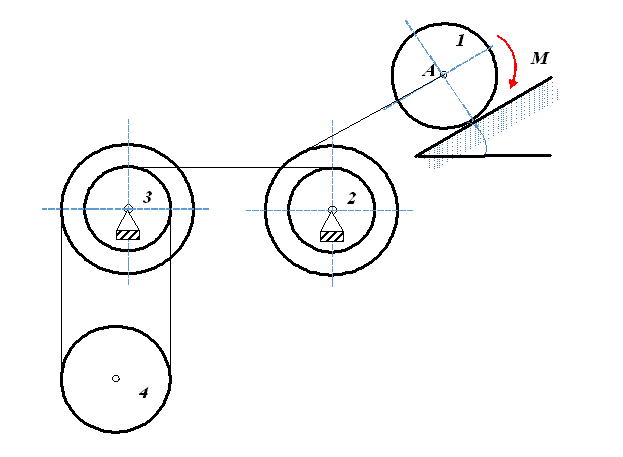 Механическая система состоит из четырёх цилиндров, связанных между собой нерастяжимыми тросами. Используя общие теоремы динамики, составить систему уравнений, описывающих движение заданной механической системы.