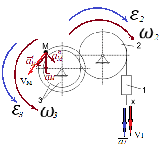 По заданному уравнению прямолинейного поступательного движения груза 1 определить скорость, а также вращательное, центростремительное и полное ускорение точки М механизма в момент времени t1.