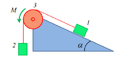 Тела 1 и 2 связаны невесомой нитью, переброшенной через блок 3. Блок закреплен в центре неподвижным шарниром, не него действует пара сил с моментом М.
