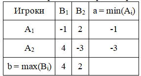 Находим гарантированный выигрыш, определяемый нижней ценой игры a = max(ai) = -1, которая указывает на максимальную ч...
