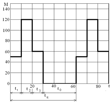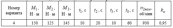 В таблице приведены моменты М1, М2, М3 нагрузки на валу двигателя для соответствующих участков графика нагрузки, время работы двигателя с заданными моментами нагрузки, время паузы