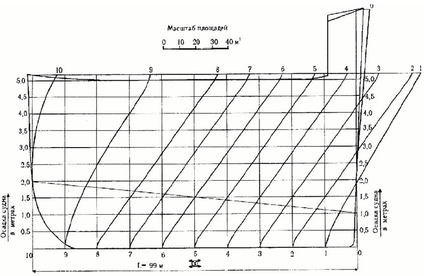«Воспользоваться масштабом Бонжана судна и определить водоизмещение судна и абсциссу ц.в. при осадке судна носом, кормой.»