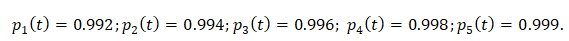 Система состоит из N = пять частей. Надёжность каждой части изделия характеризуется вероятностью p_i (t) безотказной работы в течении времени t, которая равна: